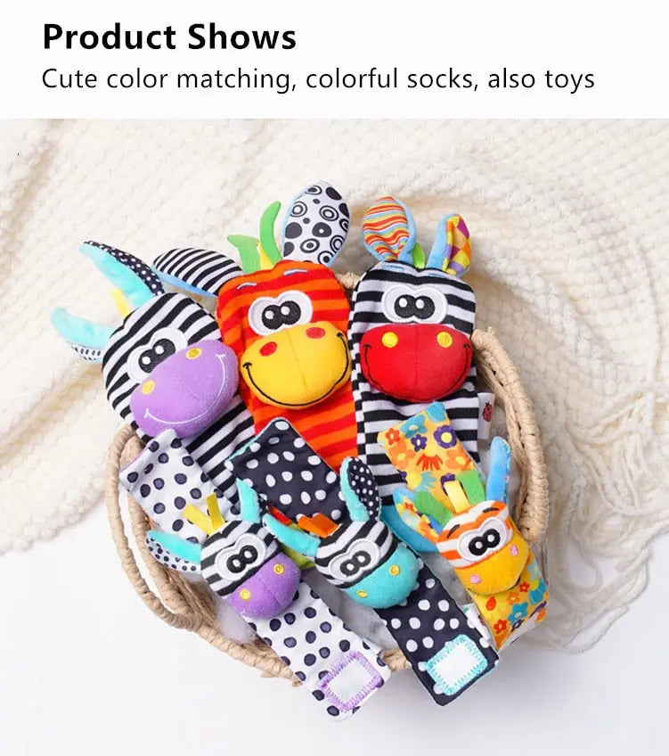 赤ちゃんの手足の動きを楽しく引き出す、ソックス型・リストバンド型のガラガラ知育おもちゃセットです。足首や手首に巻くだけで、動かすたびにやさしい音が鳴り、「蹴る・振る・動かす」体験を自然にサポート。カラフルな動物デザインとやわらかな素材で、視覚・聴覚・触覚をバランスよく刺激します。新生児期から使える軽量設計で、おうち時間はもちろん、お出かけ先でも活躍する実用的なベビートイです。