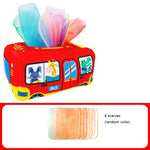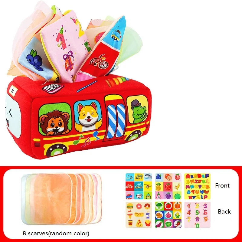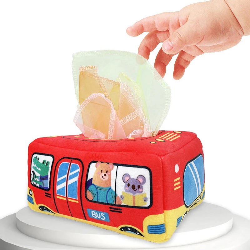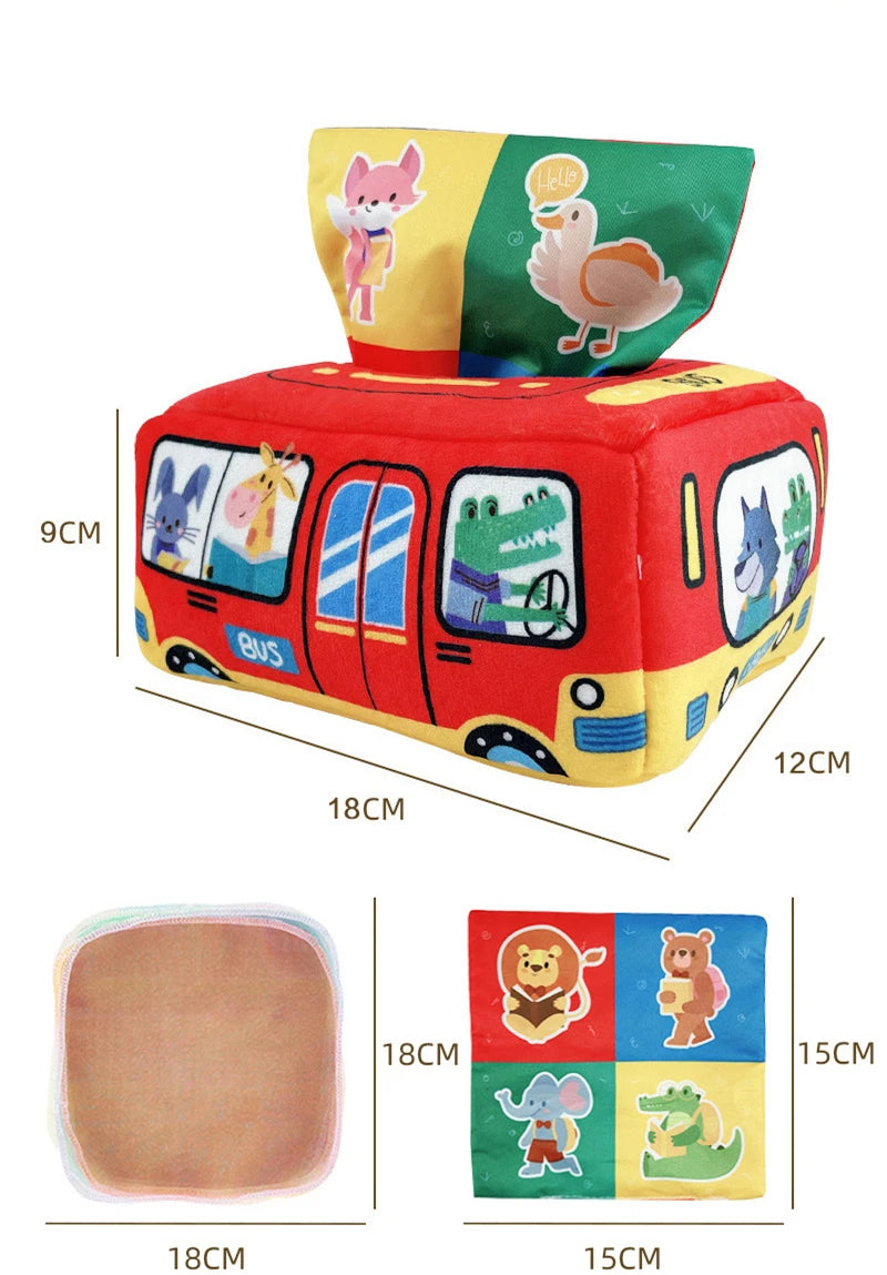 布ティッシュ引っぱり遊びボックス|モンテッソーリ風 感覚あそび知育トイ|バス柄・くるま柄 ティッシュボックスおもちゃ|赤ちゃん指先あそび 布おもちゃ|出産祝い・おうち遊び